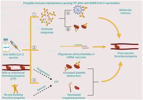 Possible immune mechanisms causing ITP after anti-SARS-CoV-2 vaccination: (1) Immune response causing production of protective antibodies against SARS-CoV-2 (A) with possible molecular mimicry against platelet antigens (B); (2) oligosense antinucleotides in mRNA vaccines causing post-vaccine thrombocytopenia; (3) development of ITP, either de novo or progression from sub-clinical ITP after anti-SARS-CoV-2 vaccine.