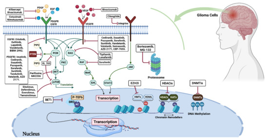 Schematic overview of molecules that have a vital role in GBM treatment. Growth factor receptors and intracellular signaling pathways can be activated in glioblastoma, thereby triggering gliomagenesis. Such pathways have the ability to induce tumor survival, invasiveness, proliferation, evading apoptosis, and avoiding immune surveillance [69]. EGF, VEGF, and PDGF, as well as the receptors thereof, can be blocked by small molecules and monoclonal antibodies [69]. Epigenetic process inhibitors, such as HDACis, DNMTis, BETis, and EZH2is, also have an important role to play in the treatment of patients suffering from GBM [69].
