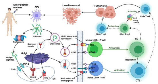 ICD induces the production of tumor-associated antigens and immune-stimulatory molecules, which attracts the antigen-presenting cells (APCs) to the site of infection. Activated APCs ingest the tumor-associated antigens (TAAs) and detect the DAMPs via pattern recognition receptors (PRRs). Fully developed APCs travel to the lymph node to activate the anti-tumor cytotoxic CD8+ T lymphocytes (CTLs). Activated CTLs would lead to anti-glioma immunity. The recruitment of tumor-specific CTLs to the tumor site is derived from the viral-mediated production of type-I IFN and chemokine. Since the TAAs of glioma cells are displayed by their major histocompatibility complex (MHC) class I, CD8+ T lymphocytes can detect and kill them [252,260].