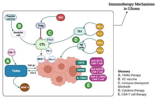 New immunotherapy strategies are being investigated in various preclinical and clinical investigations. During the clinical trials, unexpected responses have been observed and CAR-T cells have shown promising outcomes. Further studies are imminently required to reach a conclusion regarding the routine application of immunotherapy in glioblastoma treatment [160]. In the following sections, we will discuss the role of various immunotherapeutic approaches in glioma.