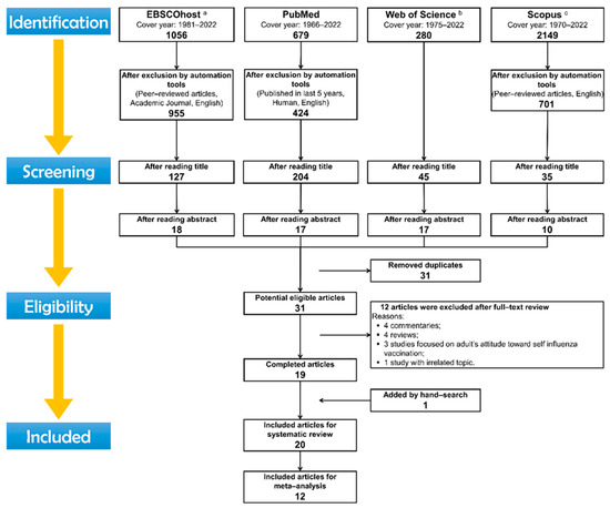 Preferred reporting items for systematic reviews and meta-analyses (PRISMA) flow diagram: search process for study selection about parental willingness to pediatric vaccination in the era of COVID-19. a Included databases of EBSCOhost are CINAHL with Full Text, ERIC, MEDLINE, APA PsycArticles, APA PsycInfo; b included databases of Web of Science are SSCI and A&HCI; c included both published papers and preprinted services.