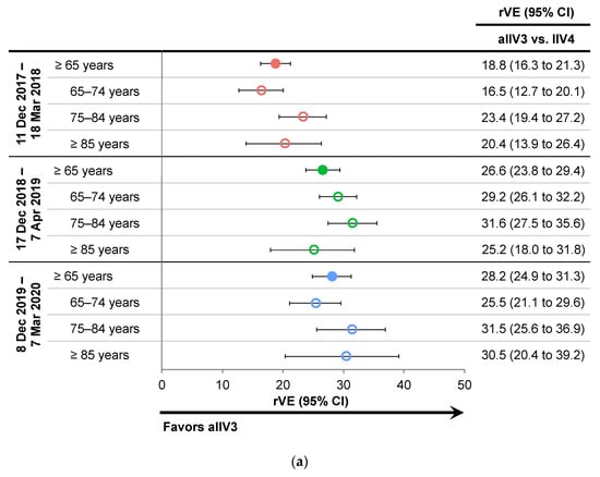 Relative vaccine effectiveness (rVE) of adjuvanted trivalent inactivated influenza vaccine (aIIV3) vs. comparators for the prevention of influenza related medical encounters during the three influenza seasons between 2017 and 2020 in subjects ≥65 years of age and by age subgroups [22,24]. (a) aIIV3 vs. egg-based quadrivalent inactivated influenza vaccine (IIV4e); (b) rVE for aIIV3 vs. high-dose trivalent inactivated influenza vaccine (HD-IIV3). CI, confidence interval.