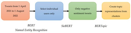 Next, the named entity recognition, which recognises location, organisations, person, and miscellaneous entities, was used to select individual users only []. Individual Twitter users were identified by the use of actual human names on the Twitter account of each post. The SieBERT, a pretrained sentiment in English analysis model, was applied, and only negative sentiments tweets were selected []. Topic modelling, specifically BERTopic [], was employed to generate coherent key concerns on the public discourse on COVID-19 vaccination. The data processing and machine learning approach is summarised in Figure 1.