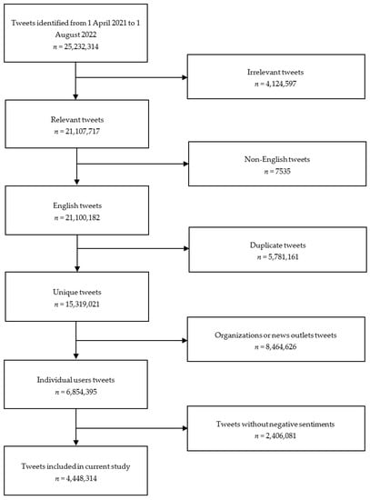 A total of 25,232,314 initial tweets were identified in the period of 1 April 2021 to 1 August 2022. After removing duplicate tweets, tweets by organisations, and tweets without relevant terms of “COVID-19”, “vaccine”, or “vaccination”, a final 4,448,314 tweets remained. The flowchart showing the tweet selection process is illustrated in Figure 2.