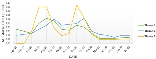 Temporal variations in the normalised frequency of tweets belonging to Theme 1 (Topics 1 and 2), Theme 2 (Topics 3 and 4), and Theme 3 (Topics 5 and 6).