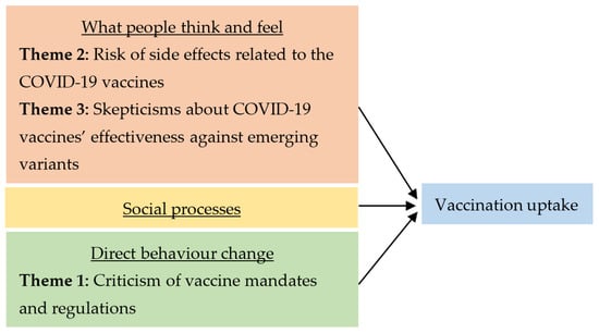 As illustrated in Figure 4, Themes 2 and 3 relate to an individual’s risk appraisal and confidence in the COVID-19 vaccine, and these thoughts and feelings motivate one to get vaccinated or not. Theme 2 highlights the public concerns regarding the risk of post-vaccination myopericarditis, which tends to happen in young males []. In the design of public communications surrounding the COVID-19 vaccines, it may help to acknowledge these concerns and explain that post-vaccination myopericarditis cases are rare and may happen with non-COVID-19 vaccines as well (with comparably low incidence rates) []. It is important to contextualise these risks to background rates and communicate it effectively to the public as public risk perception is particularly disposed to scare stories and fearmongering. A no-fault vaccine injury compensation programme may also help provide further reassurance to the public [].
