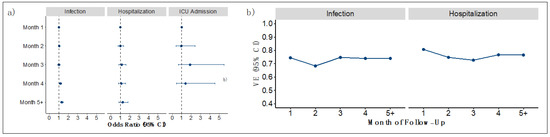 Ad26.COV2.S estimated durability and vaccine effectiveness from 27 February 2021 to 7 September 2021. (a) Estimated ORs (95% CI) assessing durability of baseline vaccine protection against infections, hospitalizations, and ICU admissions; (b) estimated VE (95% CI) against infections and hospitalizations by month of follow-up for primary vaccination.