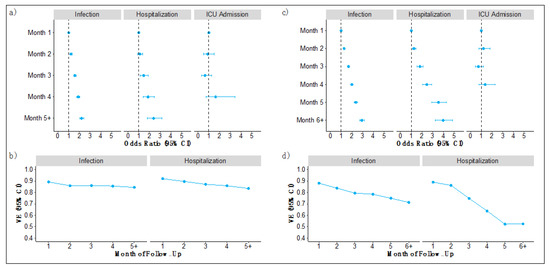 mRNA-1273 vaccine durability and vaccine effectiveness using two available time periods in (a,b) from 27 February 2021 to 7 September 2021; and (c,d) from 1 January 2021 to 7 September 2021. Each time period presents separately (a,c) estimated ORs (95% CI) assessing durability of baseline vaccine protection against infections, hospitalizations, and ICU admissions; (b,d) estimated VE (95% CI) against infections and hospitalizations by month of follow-up for primary vaccination.