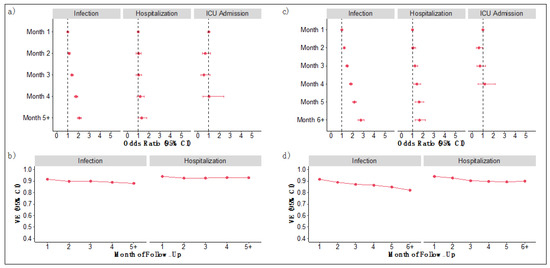 BNT162b2 vaccine durability and vaccine effectiveness using two available time periods in (a,b) from 27 February 2021 to 7 September 2021; and (c,d) from 1 January 2021 to 7 September 2021. Each time period presents separately (a,c) estimated ORs (95% CI) assessing durability of baseline vaccine protection against infections, hospitalizations, and ICU admissions; (b,d) estimated VE (95% CI) against infections and hospitalizations by month of follow-up for primary vaccination.