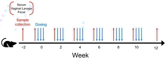 Blood, fecal, and vaginal samples were collected from each animal prior to administration of vaccination for investigation of antibody titers. Fecal samples were collected and homogenized with PBS supplemented with ProteaseArrest at a 10× weight-to-volume ratio. Homogenates were centrifuged at 9000 RCF for 10 min to pellet particulates and bacteria. Clear supernatants were aliquoted and stored at −80 °C for long-term storage. Fecal samples for microbiome analysis were collected directly from the anus of the animal into a sterile PCR tube and placed immediately on ice and transferred to −80 °C freezer for long-term storage. Serum samples were collected via tail bleeds. Blood was collected with a microvette (Sarstedt, Nümbrecht, Germany) and processed according to the manufacturer’s protocols for serum isolation. Serum was aliquoted and stored at −80 °C. Vaginal lavage samples were collected by gently washing the vagina of the mice with 100 ul of PBS. The collected sample were immediately placed on ice, centrifuged at 9000 RCF to pellet any debris, and then aliquoted and stored at −80 °C.