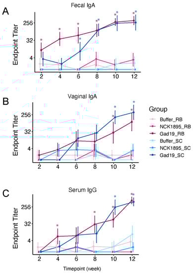 An enzyme-linked immunosorbent assay (ELISA) was developed for the detection of MPER-specific and SlpA-specific murine antibodies from serum, fecal, and vaginal samples. Plates (Maxisorp; Nunc, Rochester, NY, USA) were coated with either MPER peptide (Bio-Synthesis Inc., Lewisville, TX, USA) at 1 ug/mL or SlpA protein (isolated from NCK1895) in carbonate coating buffer and incubated overnight at 4 °C. Plates were washed five times with PBS containing 0.05% Tween-20 (PBST) and blocked with 1% bovine serum albumin (BSA) in PBS for one hour at room temperature (RT). Plates were washed five times again with PBST. Samples were serially diluted in 1% BSA, 0.1% Kathon in PBS, and incubated for 2 h at RT. Plates were washed five times with PBST and incubated with either anti-mouse IgG (Cell Signaling Technology, 20 ng/mL) for the serum samples or IgA (Bethyl Laboratories, 40 ng/mL) for the vaginal wash and fecal samples. Both the anti-mouse IgG and IgA antibodies were conjugated with horseradish peroxidase (HRP) and incubated for 1 h at RT. Plates were washed six times with PBST. 3,3′,5,5′-tetramethylbenzidine (TMB) peroxidase (SeraCar, Milford, MA, USA) was filtered with a 40 uM syringe filter and acclimated to RT before adding to each well. The reaction was stopped with an equal volume of 1N HCl. The absorbance was read with a plate reader (BioTek, Winooski, VT, USA), with both 450 and 570 nm recorded (to remove any background noise with the 570 nm reading). The week 2 and 0 time points were used in the calculations of the mean baseline value for each group. This mean was then added to the standard deviation for each group times the standard deviation cutoff multiplier based on a within-experimental-group sample size of 8 and a 95% confidence level []. This value was used as the cutoff value to determine the reported endpoint titers used in the statistical analysis.