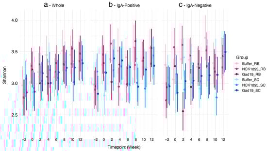 Alpha diversity was not affected by diet or vaccination: (a) predicted values of the Shannon diversity index for the whole microbiome from each timepoint (i.e., weeks 2, 0, 2, 4, 6, 8, 10, and 12) taken from each group are represented by the 95% credibility intervals; (b) IgA-positive and (c) IgA-negative microbiome fractions are also represented by the 95% credibility intervals. A linear mixed-effects model was used to determine the predicted values for each microbiome type (i.e., whole, IgA positive, and IgA negative).