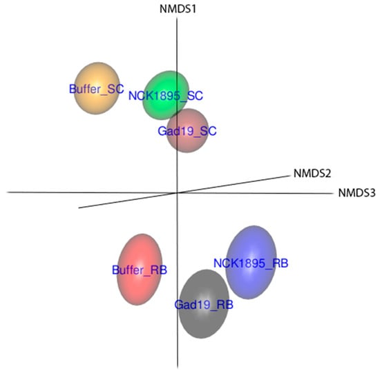 A clear separation of whole microbial communities based on diet is demonstrated in Figure 4. Beta diversity is presented based on the nonmetric multidimensional scaling (NMDS) ordination using the Bray–Curtis distance and utilizing the full dataset. The 3D representation of these data highlights the separation of the microbial communities based on diet and partially on immunization type, where the 95% confidence ellipsoids represent the community structure for each group from all three microbiome fractions. The slightly overlapping ellipsoids from GAD19_SC and NCK1895_SC represent a more similar microbiome. These treatment groups were administered the same species but different strains of L. acidophilus, indicating that shifts in the microbiome may be caused by the administration of the live L. acidophilus vector itself. The close proximity between GAD19_RB and NCK1895_RB also supports this possibility.