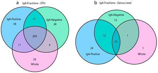 Shared and unique bacteria in different microbiome fractions. Venn diagrams represent the number of (a) OTUs or (b) genera found in the three microbiome types (i.e., whole, IgA positive, and IgA negative). Data are based on the cumulative sum scaling normalized counts for each OTU.