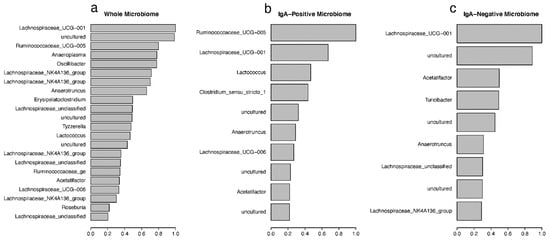 The mean decreasing Gini (MDG) coefficients plot showing the important OTUs. The MDG value represents the importance of the OTUs for (a) whole microbiome, (b) IgA-positive and (c) IgA-negative microbiome fractions. OTUs are labeled by assigned genera, from the random forest classification for each microbiome fraction. Cutoff was set to greater than 0.2.