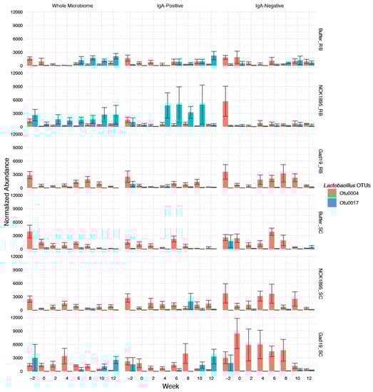 The normalized abundances of the most abundant OTUs in the Lactobacillus genus are shown for the whole microbiome (first column), IgA-positive microbiome (middle column), and IgA-negative microbiome (last column). The values are based on the normalized abundances calculated using cumulative sum scaling, as described in Section 2. Bars represent the mean count for each group at each timepoint, with error bars showing the standard error.