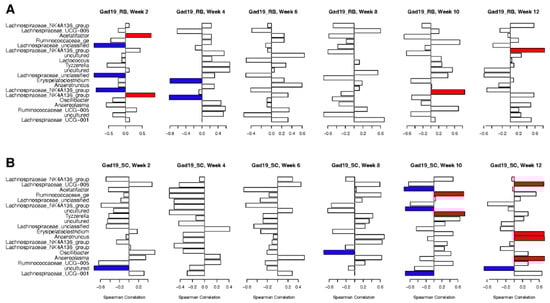 Conversely, antigen-specific IgA within the SC diet group displayed both positive and negative correlations with several different taxa during weeks 10 and 12 (Figure 8B). Significant negative correlations included Acetifactor, Lachnospiraceae_UCG-001, and an uncultured bacterium in the Lachnospiraceae family. Only Lachnospiraceae_UCG-001 continued with a negative correlation during week 12. Week 10 had two taxa that were positively correlated with antigen-specific IgA in the GAD19_SC group: Ruminococcaceae_ge and Lactococcus. However, during week 12, there were four taxa with positive correlations including Lachnospiraceae_UCG-006, Erysipelatoclostridium, Anaeroplasma, and Anaerotruncus.
