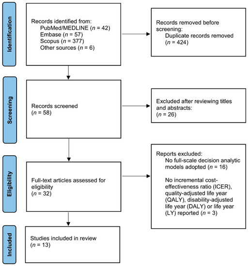 We identified 58 records from the initial screening of titles and abstracts and reviewed 32 reports in full-text (Figure 1). Thirteen studies were finally deemed eligible for inclusion [19,20,21,23,25,26,27,28,29,30,31,32]. One study evaluated the LAIV vaccination in four countries [28]. Three studies were the economic evaluations of childhood vaccination against influenza in the U.S., and another five studied in England and/or Wales [20,21,23,25,26,28,30,32]. The other studies covered countries in Canada, Germany, France, the Netherlands, Spain, Finland, Brazil, and Taiwan [19,20,27,28,29,31].