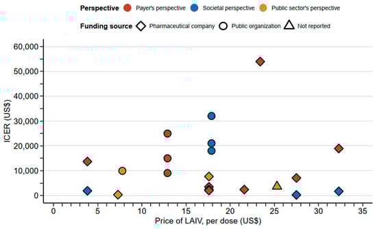 Compared with the population-based influenza immunization only for the elderly and high-risk groups or no vaccination for the pediatric population, the addition of childhood vaccination with intranasal LAIV offers an overall cost-effective strategy [21,23,24,25,27,28,29,30,31,32]. Regarding the base-case scenarios considered in the studies, most studies reported ICERs below $20,000 per unit change in QALY, DALY, or LY regardless of the prices of the LAIVs considered (Figure 2). Shim et al. set the price of LAIVs at $23.4 per dose and estimated an ICER of $53,960/QALY, which was the highest estimated ICER among the studies. Prosser et al. demonstrated the cost-effectiveness of LAIV in a younger age group (6 months to 2 years) [21,23]. The cost-effectiveness of pediatric influenza vaccination remains, even with the use of quadrivalent LAIV, which is more expensive but substantially increases the clinical impacts and health benefits for the pediatric population [26]. The sensitivity analyses within all of the included studies demonstrated the robustness of the cost-effectiveness of the pediatric influenza vaccination. The most common influencing parameters were the efficacy of LAIV among children, vaccination coverage, and the vaccine price. Two studies also included the indirect protection and thus health benefits arising from herd immunity to the rest of the population in addition to the target group [24,32]. The cost-effectiveness of pediatric vaccination with LAIV was demonstrated with the inclusion of herd immunity.