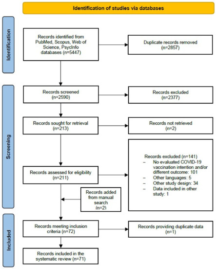 The systematic search yielded 5447 articles. After removal of duplicates, 2590 records were considered eligible (Figure 1). Screening by title and abstract returned 211 articles that were assessed by full-text analysis, of which 141 were excluded for the reasons outlined in Figure 1. Two records from a manual search were added to the previous 70, giving a total of 72 articles meeting the inclusion criteria. However, one of these duplicated data from another study and therefore was also excluded [14], leaving a total of 71 articles [10,15,16,17,28,32,33,34,35,36,37,38,39,40,41,42,43,44,45,46,47,48,49,50,51,52,53,54,55,56,57,58,59,60,61,62,63,64,65,66,67,68,69,70,71,72,73,74,75,76,77,78,79,80,81,82,83,84,85,86,87,88,89,90,91,92,93,94,95,96] that were ultimately included in the systematic review and that yielded 128 prevalence estimates of COVID-19 vaccination intention for meta-analysis.