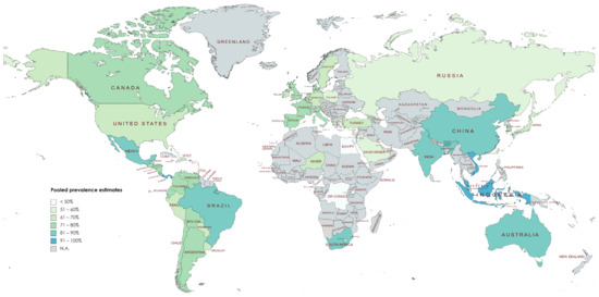 3.2. Characteristics of the Prevalence Estimates Included in the Proportion Meta-Analysis