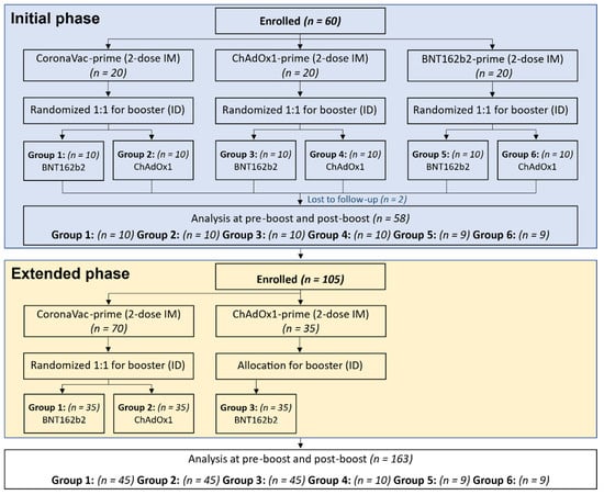 Consort Diagram showing enrollment of each group in initial phase and extended phase. Group 1 and 2 received two doses of CoronaVac intramuscularly (CoronaVac-prime), Group 3 and 4 received two doses of ChAdOx1 intramuscularly (ChAdOx1-prime), and Group 5 and 6 received two doses of BNT162b2 intramuscularly (BNT162b2-prime). Each group was randomized to receive intradermal BNT162b2 (0.05 mL, 1/6th of standard dosage) or ChAdOx1 (0.1 mL, 1/5th of standard dosage). Additional participants were enrolled in the extended phase to join Groups 1, 2, and 3.