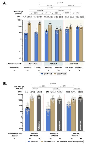 - Costa, S.A.; Weckx, L.; Clemens, R.; Mendes, A.V.A.; Souza, A.R.; Silveira, M.B.; da Guarda, S.N.F.; de Nobrega, M.M.; de Moraes Pinto, M.I.; Gonzalez, I.G.S.; et al. Heterologous versus homologous COVID-19 booster vaccination in previous recipients of two doses of CoronaVac COVID-19 vaccine in Brazil (RHH-001): A phase 4, non-inferiority, single blind, randomised study. Lancet 2022, 399, 521–529. [Google Scholar] [CrossRef]
