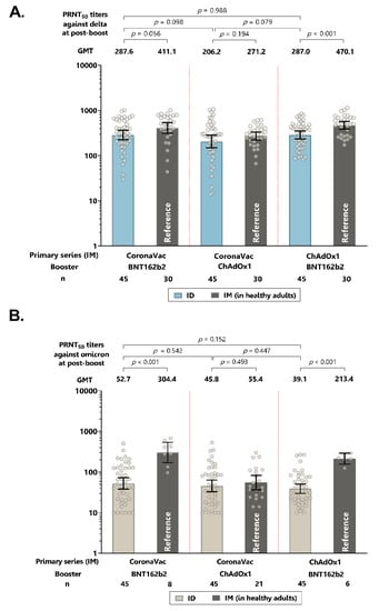 The neutralizing antibody titers against delta and omicron (BA.1) strains were determined by the 50% plaque reduction neutralization test (PRNT50) on post-booster samples. The method was described previously []. The titer of each sample was defined as the reciprocal of the highest test serum dilution; the virus infectivity was reduced by 50% of an average plaque count in the virus control wells and was calculated by using a four-point linear regression method. The PRNT50 titers below the positive cutoff of 10 were arbitrarily assigned a value of 5.