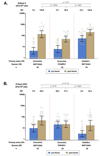 Cellular immunity was determined by IFN-γ ELISpot (Mabtech, Nacka Strand, Sweden) to ancestral strains on a subset of participants for each group (n = 20). Peripheral blood mononuclear cells (PBMCs) were counted and stimulated with S-peptides that consisted of 100 peptides from spike proteins, and nucleoprotein-membrane protein-open reading frame protein (NMO)-peptide pools, consisting of 101 peptides from nucleocapsid (n), membrane (M), open reading frame (ORF) 1, non-structural protein (nsp) 3, ORF-3a, ORF-7a, and ORF8 proteins. Negative controls contained only cell culture media, while positive controls contained an anti-cluster of differentiation 3 (CD3) at a dilution of 1:1000. ELISpot plates were then incubated for 20 h at 37 °C and 5% CO2, washed and developed using a conjugated secondary antibody that was bound to membrane-captured IFN-γ. The plates were read using IRIS (Mabtech) and spots were analyzed using Apex software 1.1 (Mabtech) and converted to spot-forming units (SFU) per million cells.