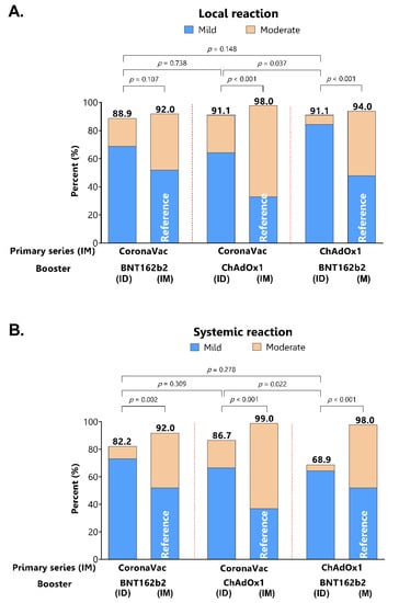 Self-reported adverse events following intradermal boosting consist of local injection site reaction (A) and systemic reaction (B). Intramuscular boosting of the similar vaccine regimens from the previous study [] is included as a reference group.
