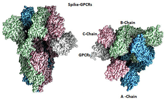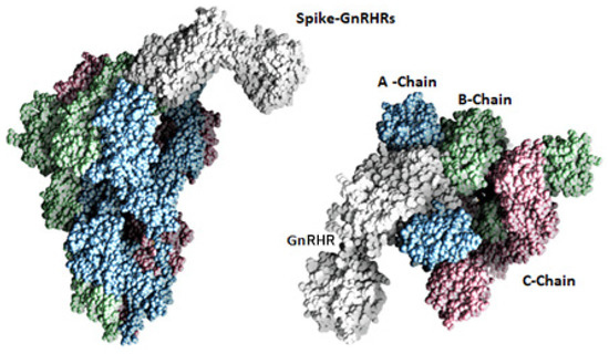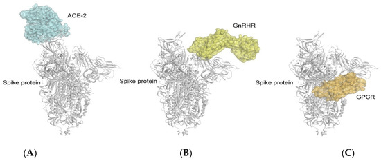 Furthermore, the crystal structure of the SARS-CoV-2 spike–ACE2 complex was extracted from the Protein Data Bank (PDB ID: 7DF4) and compared with the complexes obtained in this study, i.e., the GnRHR–spike protein and GPCR–spike protein. Interestingly, it was found that the binding of the GnRHR and GPCR with the spike protein was at different sites from that of the ACE-2 protein (relative positions of the three binding sites are indicated in Figure 6A–C). From this observation, it can be inferred that multiple receptors might be involved in the pathogenesis of COVID-19. Even in the organs having a low or no expression of ACE-2, the binding of the spike protein with the GnRHRs and/or GPCRs (at a different binding site from that of the ACE-2) may be responsible for the blocking of the signaling pathway independent from that of the ACE-2 and may result in neuroendocrine disorders in COVID-19 [3,9,10].