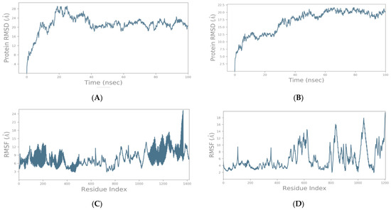 The main purpose of the MD simulation studies was to investigate the positional and conformational changes of the GnRHR and GPCR proteins with the binding site of spike proteins to gain insights into the binding stabilities of the complexes. The MD simulations revealed that the GnRHR could efficiently activate the biological pathway by changing the conformation in the C-terminal region (i.e., 0–500 residues) and the N-terminal (1100–1400 residues) in the RMSF plot in the binding site of the spike protein (Figure 4A). The Root Mean Square Fluctuation (RMSF) is useful for characterizing the local changes along the protein chain [23].