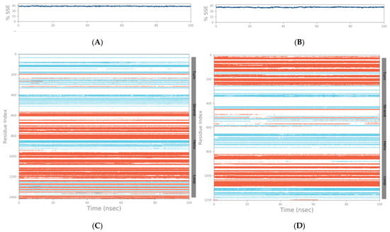 SSE composition for each trajectory frame over the course of the simulation (i.e., 100 ns) for spike–GnRHR (A) and spike–GPCR (B). Monitoring of each residue and its SSE assignment over time for spike–GnRHR (C) and spike–GPCR (D) structures (red and blue colors indicate SSE assignment i.e., alpha helix and beta-strand, respectively).