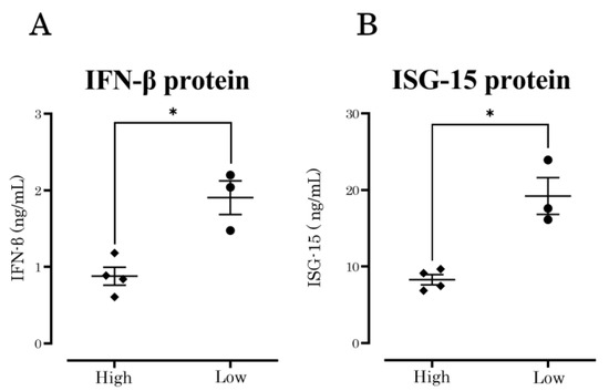 IFN-β protein expression at 24 h post-infection was significantly increased (p = 0.0067) in IAV strains with a low growth capability compared with those with a high growth capability (Figure 2A). ISG-15 protein expression at 24 h post-infection also showed the same pattern (p = 0.0038) (Figure 2B). These results showed a significant difference in IFN-β and ISG-15 production when A549 cells were inoculated with low-growth-capability strains compared with high-growth-capability strains.