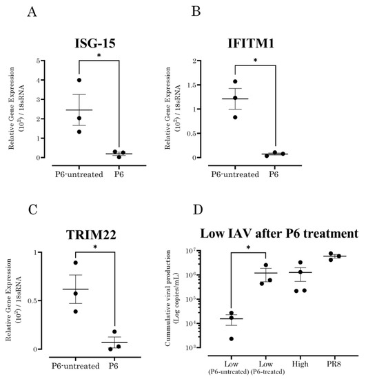 To assess the role of ISGs (ISG-15, IFITM1, and TRIM22) in the growth capabilities of seasonal IAVs, A549 cells were treated with 5 μM pyridine 6 (P6), a pan-JAK inhibitor known to inhibit ISG expression [28,30]. As expected, the expression levels of ISG-15, IFITM1, and TRIM22 were significantly reduced in the P6-treated A549 cells (Figure 3A–C). The suppression of viral ISGs in A549 cells using P6 resulted in a significant increase in viral copies (p < 0.05) at 6 h post-infection with seasonal IAV strains with a low growth capability (Figure 3D).