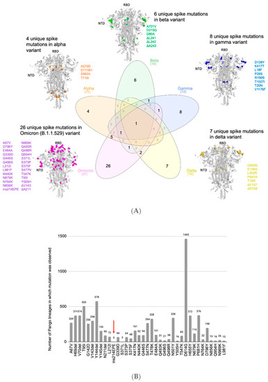 Core mutations were derived for parental lineages from the Coronavirus Antiviral Research Database (CoV-RDB; covdb.standford.edu; accessed 10 December 2021) for each variant of interest or variant of concern: Alpha (B.1.1.7), Beta (B.1.351), Gamma (P.1), Delta (B.1.617.2), Lambda (C.37), Mu (B.1.621), Eta (B.1.525), Iota (B.1.526), Kappa (B.1.617.1), and Omicron (BA.1) [27]. All SARS-CoV-2 genome sequences corresponding to the Omicron variant were directly derived from the GISAID database [2,3]. There were 1448 SARS-CoV-2 genomes annotated as B.1.1.529/BA.1/BA.2 as of 13 December 2021. These genomes were compared to other (non-Omicron) genomes deposited in GISAID before the same date to determine the number of lineages in which each Omicron Spike protein mutation was previously observed.