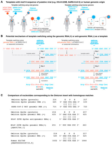 (A) Schematic representation of Omicron’s evolution through template switching involving viral (e.g., seasonal coronavirus or SARS-CoV-2) or human RNA. (B) Potential mechanism of template switching using viral genomic RNA (positive sense) or anti-genomic RNA (negative sense) as a template. Step 1: Negative-strand synthesis begins using an Omicron predecessor’s genomic RNA as template. Step 2: Negative-strand synthesis temporarily uses the genomic or anti-genomic RNA of SARS-CoV-2 or a co-infecting virus. Step 3: Negative-strand synthesis resumes using the Omicron predecessor’s genomic RNA as template. (C) Examples of matches identical to the nucleotide sequence “GAG CCA GAA” in the SARS-CoV-2 genome, the HCoV-229E anti-genome, and a human SLC7A8 transcript are shown.