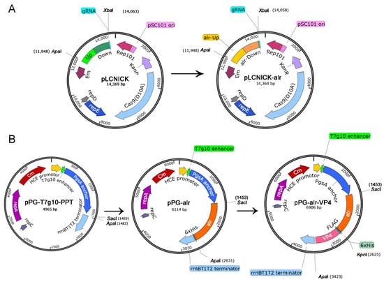 Schematic diagram of the construction of DNA plasmids. (A) The sgRNAs of alr were fused with the upper and lower homologous arms of the alr gene, and the sequence was inserted into the pLCNICK gene editing vector, which resulted in the pLCNICK-alr gene editing vector. (B) The constitutive cell surface expression plasmid pPG-T7g10-PPT (left). The alr gene was amplified from L. casei W56, cleaved using SacI and ApaI, and was inserted into the expression plasmid pPG-T7g10-PPT, named pPG-alr (middle). The VP4 gene was amplified from the PoRV JL94 strain, cleaved with KpnI and ApaI, and was inserted into pPG-alr, obtaining the recombinant plasmid pPG-alr-VP4 (right).