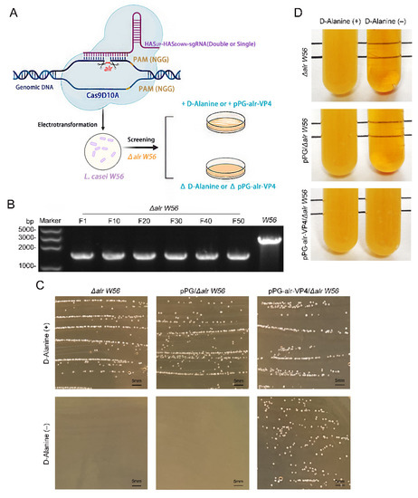 Construction of alr-auxotrophic mutant L. casei Δalr W56. (A) Schematic diagram of the preparation of L. casei Δalr W56 using the CRISPR/Cas9D10A system. (B) Identification of alr gene depletion in the genomes of L. casei W56 and L. casei Δalr W56 by PCR using alr-F/R as primers. L. casei Δalr W56 was serially passaged 50 times and the genome extracted every 10 passages was identified by PCR and DNA sequencing. (C) Strains L. casei Δalr W56, pPG/Δalr W56, and pPG-alr-VP4/Δalr W56 were cultivated on MRS solid plates with and without D-Alanine. (D) Strains L. casei Δalr W56, pPG/Δalr W56, and pPG-alr-VP4/Δalr W56 were cultivated in MRS liquid medium with and without D-Alanine.