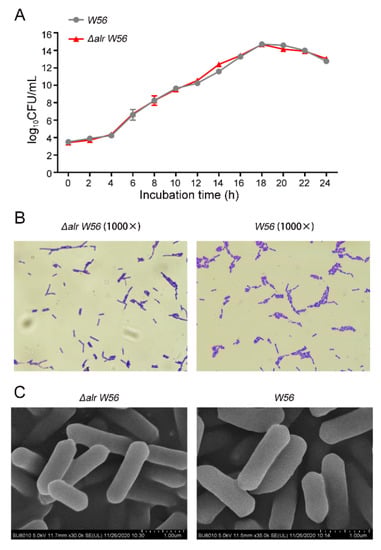 The L. casei Δalr W56 and L. casei W56 strains in the logarithmic growth phase were subjected to gram staining, and the morphological characteristics of the bacteria were observed under the microscope. The results showed that the mutant strain was blue-purple, short rod-shaped, and in a chain-like arrangement, which was consistent with L. casei W56 (Figure 3B). Similarly, the scanning electron microscope results also showed that compared with L. casei W56, the morphological characteristics of L. casei Δalr W56 did not change significantly (Figure 3C).