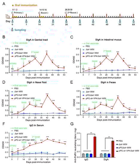 Levels of anti-PoRV-specific SIgA and IgG in immunized mice. (A) Schematic of oral immunization program and schedule of sampling genital tract fluid, intestinal mucus, nasal fluid, feces, and sera. The immunization program was immunization each time for three consecutive days, once every two weeks, for a total of three times. Samples were taken every 7 days until day 63. (B–E) Specific anti-PoRV SIgA levels in genital tract (B), intestinal mucus (C), nasal fluid (D), and feces (E) of mice were determined post-immunization with strains L. casei Δalr W56, pPG/Δalr W56, pPG-alr-VP4/Δalr W56, or PBS. (F) Detecting the level of anti-PoRV specific IgG antibody in serum. (G) The neutralizing activity of anti-PoRV specific IgG antibody in serum and SIgA in intestinal mucosa were detected. Three parallel groups of each sample were sampled each time, and the samples from each group were analyzed as one sample in triplicate. n = 3, mean ± SD, Student’s test, ns, not significant, *, p < 0.05, **, p < 0.01, ***, p < 0.001.