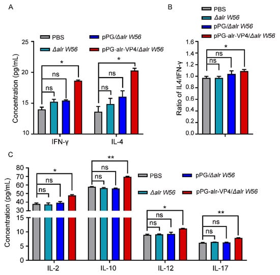 Cytokine secretion level in immunized mice. The mice were immunized thrice with strains L. casei Δalr W56, pPG/Δalr W56, pPG-alr-VP4/Δalr W56 or PBS. (A) The serum was collected and the cytokine for IFN-γ or IL-4 was detected. (B) The ratio of IL4/IFN-γ was analyzed. (C) The serum was collected and the cytokines for IL-2, IL-10, IL-12, and IL-17 were detected. n = 3, mean ± SD, Student’s test, ns, not significant, *, p < 0.05, **, p < 0.01.