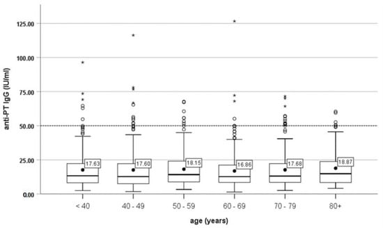 The highest mean titers of anti-PT IgG and 18.87 IU/mL were recorded in the age group of 80+ years, followed by the age group of 50–59 years with 18.15 IU/mL, and the lowest mean title of anti-PT IgG was recorded in the age group of 60–69 with 16.86 IU/mL (Figure 2). Further, we analyzed anti-PT IgG (separating in two subgroups (>40 IU/mL vs. <40 IU/mL)) by age groups using the Chi-square test for trend. The result was not statistically significant, as the p-value was 0.908 (results not shown).