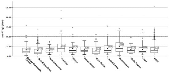 Anti-PT IgG (mean titers) ranged between regions from 25.18 IU/mL of region of Peloponnese followed by the region of Thessaly with 23.37 IU/mL, and the lowest proportion was recorded by the region of Central Macedonia with 14.22 IU/mL, anti-PT IgG (Figure 3).