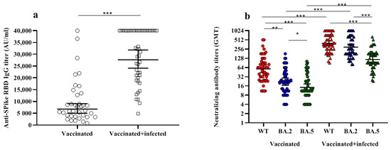 Finally, naïve vaccinated subjects, who had been infected about 15 days after sampling (13/50), showed a neutralizing titer against all strains comparable to that of the uninfected group (GMT WT = 48.1 vs. 62.5; BA.2 = 17.5 vs. 23.0; BA.5 15.2 vs. 14.8; p > 0.5). Indeed, GMTs against BA.5 were below the threshold to confer protection to SARS-CoV-2 [23].
