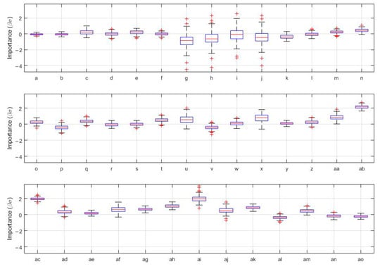 Machine learning models of vaccine hesitancy; boxplots of out-of-sample importance of factors from a single imputation and 200 repetitions of bootstrap resampling for logistic regression models, with the outcome of significant or some hesitancy vs. no hesitancy. a Age; b sex (male); c role (family member); d role (health care professional), e role (patient); f part of a vulnerable population (yes); g highest level of education (bachelor’s degree or above); h highest level of education (high school graduate); i highest level of education (some high school); j highest level of education (technical/vocational training); k employment (retired), l employment (yes); m living with (healthy adults); n living with (high risk people); o living with (susceptible people); p immunosuppression (yes—other); q immunosuppression (yes—rheumatic disease); r cancer (yes); s hypertension (yes); t diabetes mellitus (yes); u kidney disease (yes); v smoke (yes); w previous influenza vaccine (yes); x previous COVID-19 infection (yes); y language (English); z previously rejected influenza vaccine (yes); aa perception of receiving enough information about COVID-19 prevention (no); ab vaccine compulsory (no); ac vaccine compulsory (unsure), ad trust that the government is making decisions in citizens’ best interest regarding COVID-19 vaccines (no); ae access barrier to vaccination would prevent participants from receiving a COVID-19 vaccine (yes); af trust pharmaceutical companies to provide safe and effective COVID-19 vaccines (no); ag trust pharmaceutical companies to provide safe and effective COVID-19 vaccines (unsure); ah concerns that a future COVID-19 vaccine might not be safe (a little concerned); ai concerns that a future COVID-19 vaccine might not be safe (very concerned); aj vaccine benefits outweigh its risks (no); ak vaccine benefits outweigh its risks (unsure); al social pressure to receive a COVID-19 vaccine in the future (no); am social pressure to receive a COVID-19 vaccine in the future (unsure); an risk-taking behavior (moderate); ao risk-taking behavior (high).