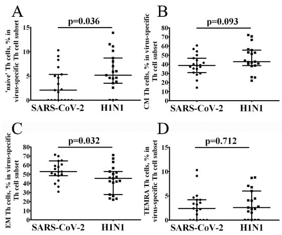 This study involved a cohort of patients who had recovered from COVID-19 because we had previously demonstrated that these patients had high levels of CD4+ memory T cells specific to SARS-CoV-2- and H1N1 influenza, whereas COVID-19 naïve subjects had influenza-specific but not SARS-CoV-2-specific responses [13]. To investigate the SARS-CoV-2-specific CD4+ T cell response, we stimulated freshly isolated PBMCs with live SARS-CoV-2 or H1N1 influenza viruses, and CD137+CD69+ cells were considered virus-specific cells among CD4+ T cells. Circulating SARS-CoV-2 memory CD4+ T cell responses were quite robust (CD137+CD69+ were clearly detected in all 19 samples), but the related number of SARS-CoV-2-specific cells within total CD45RA– memory Th cell subset was lower than the related number of H1N1-specific Th cells (0.06% (0.04; 0.11) vs. 0.15% (0.11; 0.32), p < 0.001).