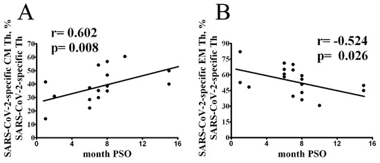 We further investigated the relationship between the time of post-symptom onset and the proportion of the SARS-CoV-2-specific Th cell subset of differentiation status. Correlative analyses demonstrated that the frequency of SARS-CoV-2-specific CM and EM CD4+ T cell was strongly associated with the time post-symptom onset (Figure 2A,B, respectively).