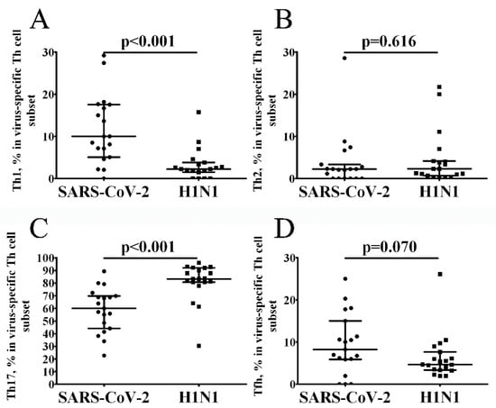 Influenza viruses are one of the main viral respiratory pathogens that, before the new coronavirus disease pandemic emerged in 2019 (COVID-19), caused up to 645,000 annual influenza-associated illness deaths [1]. The COVID-19 pandemic continues to cause a severe socio-economic crisis around the world, with over 560 million cases and over 6.3 million fatalities registered to date [2]. These two human respiratory pathogens generate distinct profiles of antigen-specific CD4+ and CD8+ T-cell responses upon infection [3,4], which potentially can contribute to the different levels of protection against re-infection with antigenically evolved viruses that escape from antibody immunity. It is very important to assess the levels of virus-specific CD4+ T cells responses because different Th subsets play a main part in the synergy between innate and adaptive immunity, leading to more effective and successful infection control [5]. It was shown that accelerated pathogen recognition and the early appearance of SARS-CoV-2-specific CD4+ T cells in circulation had the strongest association with the severity of COVID-19, since effective and early induction of these T cells in acute COVID-19 has resulted in a milder form of the disease with accelerated viral clearance, whereas the lack of SARS-CoV-2-specific Th cells was closely linked with severe COVID-19 (reviewed in [6]). During the acute phase of COVID-19, SARS-CoV-2-specific CD4+ T cells appeared relatively early and increased over time [7,8]. Analysis of PBMCs from COVID-19 convalescents found T cells that were specific to various SARS-CoV-2 antigens, such as Spike (S), membrane (M) and nucleoprotein (N) [9]. These circulating virus-specific CD4+ T cells were identified in 100% of patients recovered from COVID-19 [10]. Furthermore, spike-specific T cells dominated in total SARS-CoV-2-specific CD4+ T cell responses (up to 27% of the total CD4+ response), while the M and N proteins each accounted for 21% and 11% of the total CD4+ response, respectively. Other minor SARS-CoV-2 proteins, such as NSP3, NSP4, and ORF8, account on average for about 5% of the total CD4+ T cell response [11]. However, for both influenza virus and SARS-CoV-2, the use of peptide libraries encompassing certain viral proteins or predicted MHC I or MHC II restricted epitopes to stimulate PBMCs in vitro can lead to underestimation of virus-specific CD4+ and CD8+ T cell levels due to the detection of a limited T cell repertoire compared to using an unbiased peptide library [12]. In this regard, the use of live replicating viruses for in vitro stimulation of PBMCs might be particularly advantageous over stimulation with overlapping peptide pools or epitope-specific peptides because presentation of a unique pool of viral epitopes from all viral structural and non-structural proteins will be possible for each individual. Therefore, the repertoire of detected SARS-CoV-2- and influenza-specific T cells can be significantly increased. Earlier we demonstrated that the stimulation of PBMCs of COVID-19 patients with live SARS-CoV-2 and H1N1 influenza virus revealed the persistence of virus-specific IFNγ-secreting memory CD4+ T cells in circulation [13]; however, little is known about the composition of T-helper cell subsets specific to these respiratory viruses.