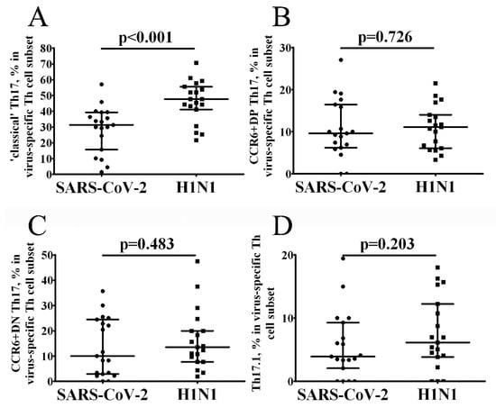 Frequency of circulating SARS-CoV-2- and H1N1-specific Th17 cell. Scatter plots A-D showing the percentages of CCR4+CXCR3– ‘classical’ Th17 (A), CCR4+CXCR3+CCR6+ DP Th17 (B), CCR4–CXCR3–CCR6+ DN Th17 (C) and CCR4–CXCR3+ Th17.1 (D) within the total virus-specific Th cell population, respectively. Black circles—SARS-CoV-2-specific CD4+ T cells (n = 19); black squares—H1N1-specific CD4+ T cells. Each dot represents individual subjects, and horizontal bars represent the group medians and quartile ranges (Med (Q25; Q75). Statistical analysis was performed with the Mann-Whitney U test.